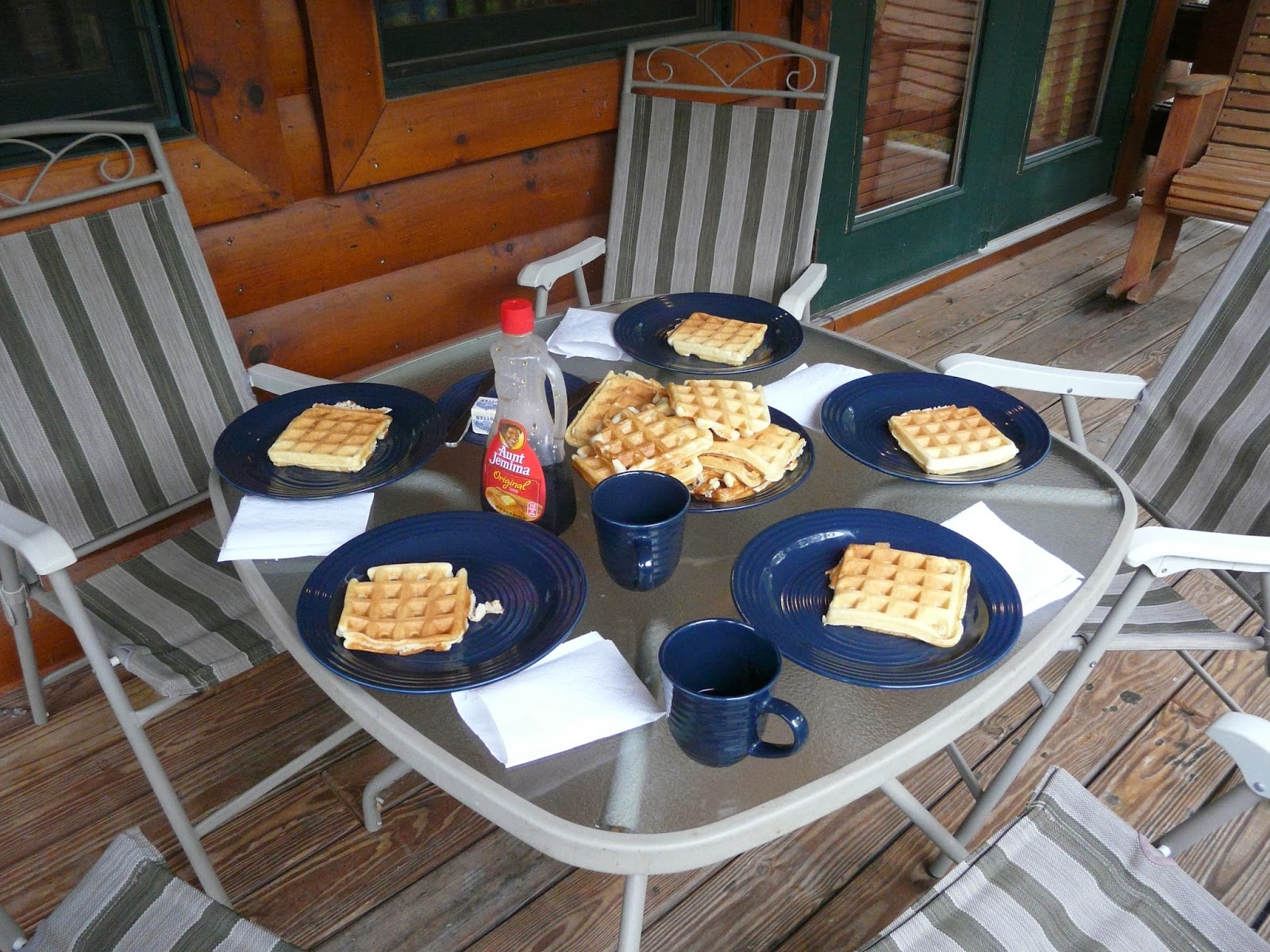 Heute müssen wir die Berge leider schon wieder verlassen.... aber vorher gibt es nach dem Ausschlafen noch ein gemütliches Waffelfrühstück auf der Terrasse der Blockhütte. Da wir bisher keine Bären gesichtet haben, wäre jetzt nochmal ein guter Zeitpunkt, um nach ihnen Ausschau zu halten :)